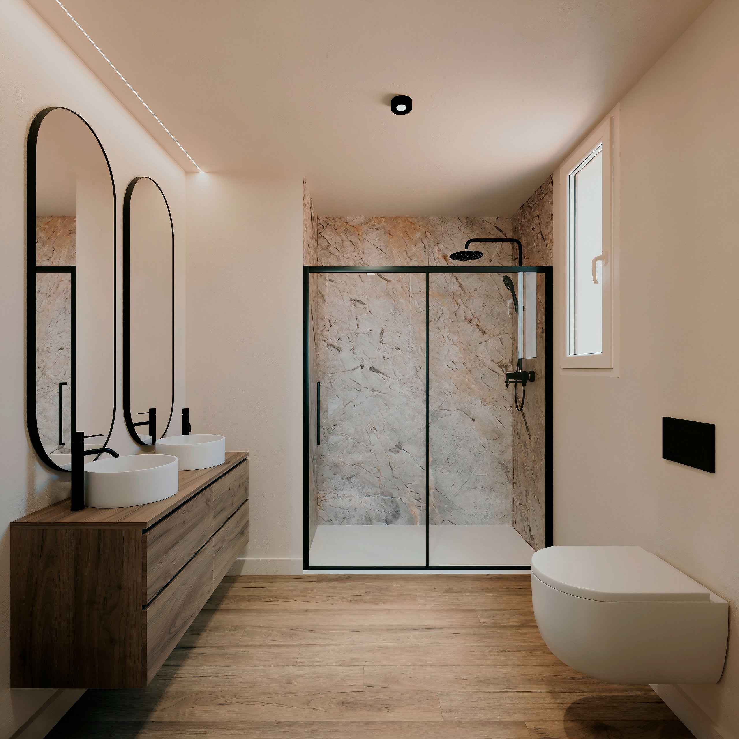 Kitchen equipped with pyrolytic oven, induction hob, built-in extractor, combined fridge, microwave with grill, dishwasher, and washer/dryer. Cabinets in RAL 9001 lacquered MDF with natural oak accents. Dekton Entzo countertop with Teka sink and matte black Roca Cala mixer.
