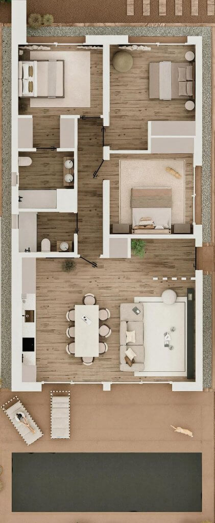 All Stone villas are single-storey, designed for effortless living and seamless flow between indoor and outdoor spaces.